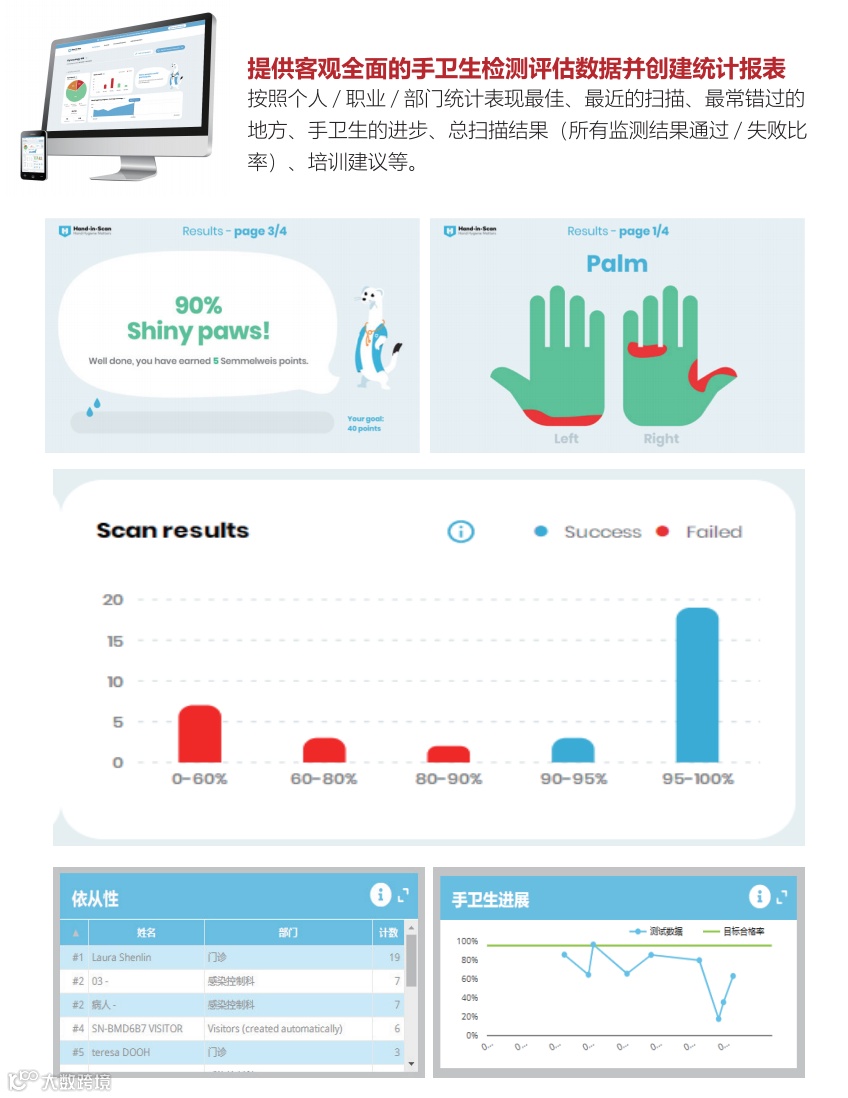 通过Hand in Scan™系统的客观监测与即时反馈,医护人员手卫生达标率从58%跃升至90%+,更推动: