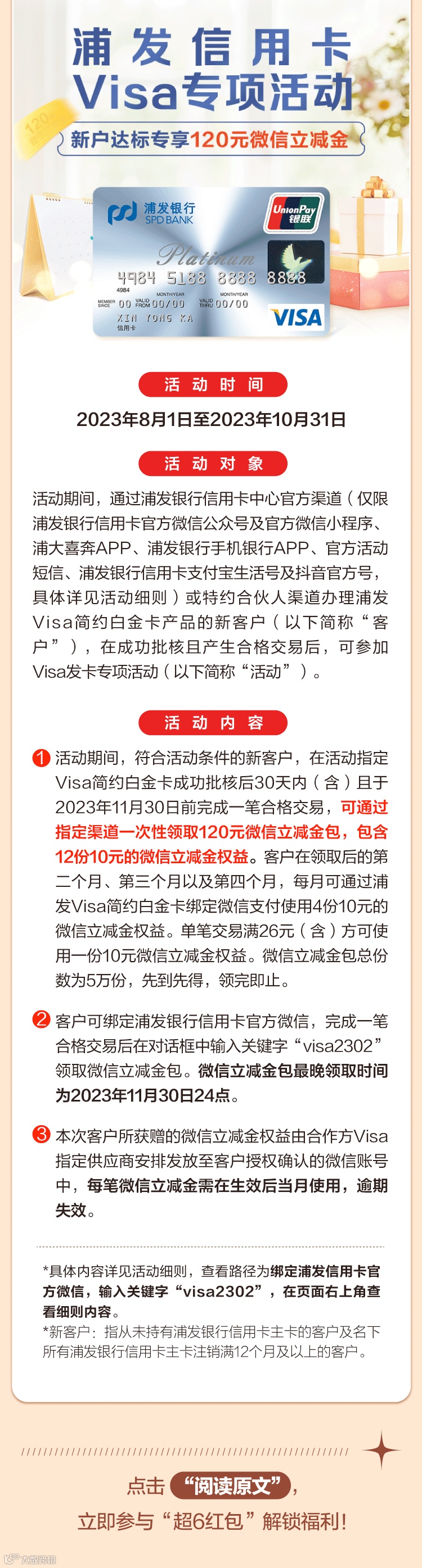 领红包了!消费享超6红包,最高666元!推荐办卡,最高可享11300元微信立减金!