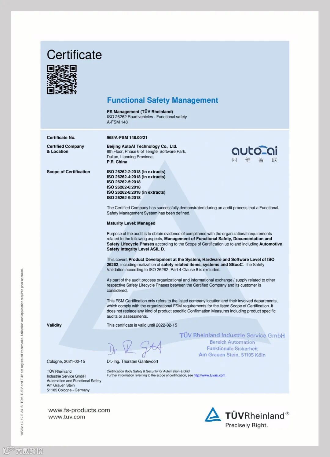 这标志着四维智联满足了 ISO 26262:2018 非常严苛的要求,也意味着四维智联在功能安全管理体系已达到业界领先水平。