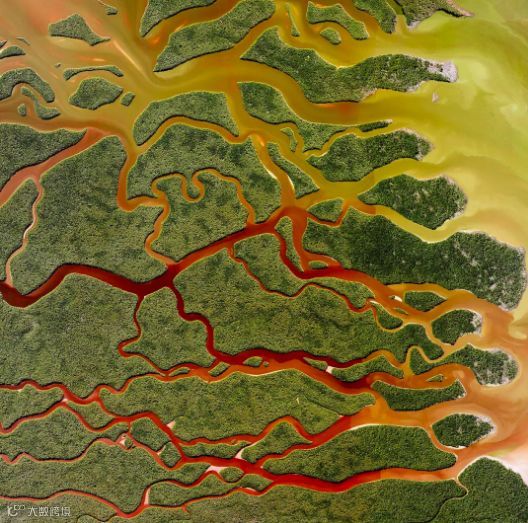 伊朗Musa湾的Shadegan泻湖周围排布着树枝状的水流形态。