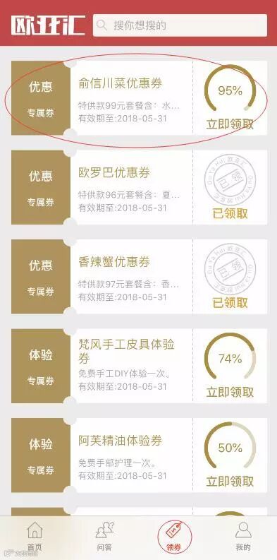 打开欧亚汇APP,在最下方领券选项中找到此优惠券