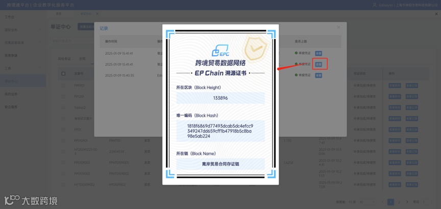 作为功能上线后的初步试点,目前已实现印花税申报存证57笔,涉及企业57家,单证486份,支持合同、发票、