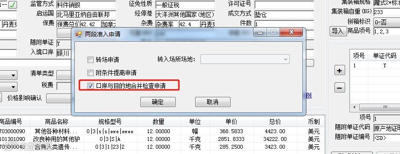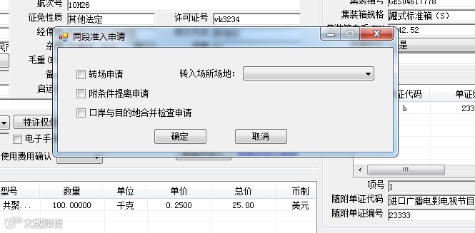 企业申报进口、进境申报类型,录入报关单,申报前点击界面上“两段准入申请”,弹出“两段准入”申请对话框。