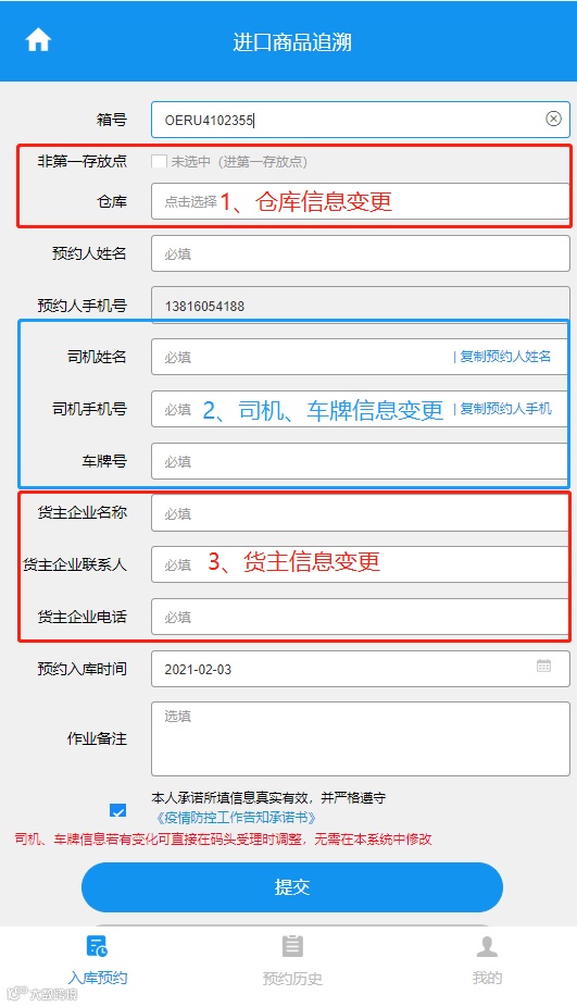 3、货主信息变更:请先取消预约,取消成功后再重新录入;