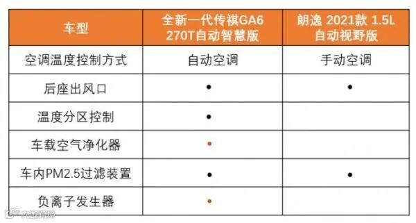 在保证车内空间宽敞、舒适的同时,全新一代传祺GA6还把空气健康作为重中之重,车辆配备了PM2.5过滤装置、车载空气净化器与负离子发生器,并采用水性PVC材料,杜绝异味来源,贯彻“材料-零部件-整车”的三级正向管控体系,打造领先的车内空气质量水平,使用户享有洁净、清新的车内空气环境。反观朗逸只搭载了PM2.5过滤装置,即使用户选择售价更高的车型,也无法享受全新一代传祺GA6般健康、清爽的空气,这一点上,朗逸的表现与全新一代传祺GA6明显不在一个级别上。