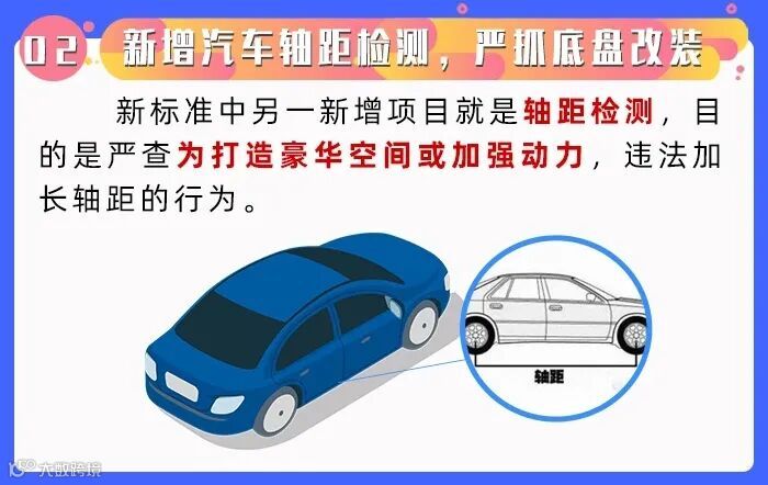 这个检测项目主要检测车辆的现有轴距数据是否与出厂数据相同,这项规定主要是为了限制部分车主为增加车内的豪华空间或增加动力、越野性能而私自加长或缩短轴距。可以说是为改装车而设。