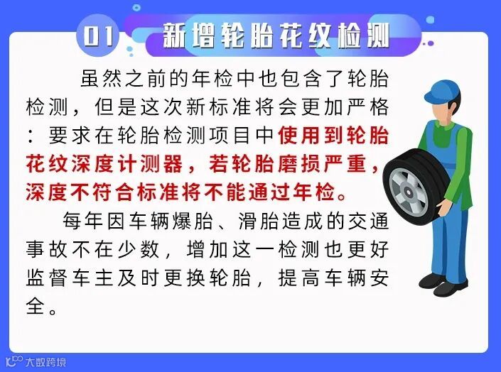 高速爆胎引发的事故也不少见,这次新增轮胎检测项目,可以减少由于轮胎老化而导的事故。