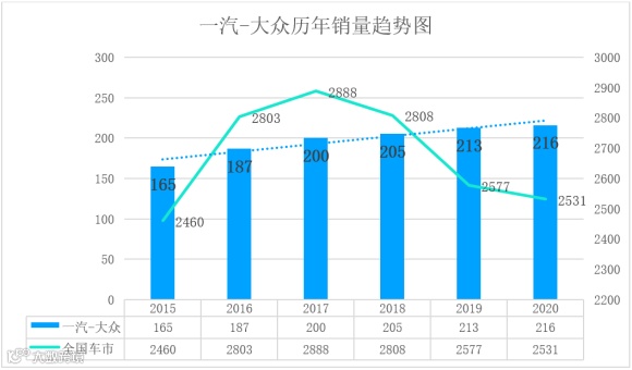 2020年初新冠疫情的来袭打乱了全国人民欢度春节的节奏,同时也为已经连续两年总销量下滑的中国车市蒙上了又一层阴影:2020年,全国车市“不出意外”的微跌1.9%。然而反观一汽-大众却交出了连续第N年增长的答卷:全年实现终端销售新车216.18万辆,同比增长1.5%,成为唯一全年销量突破200万辆的车企。