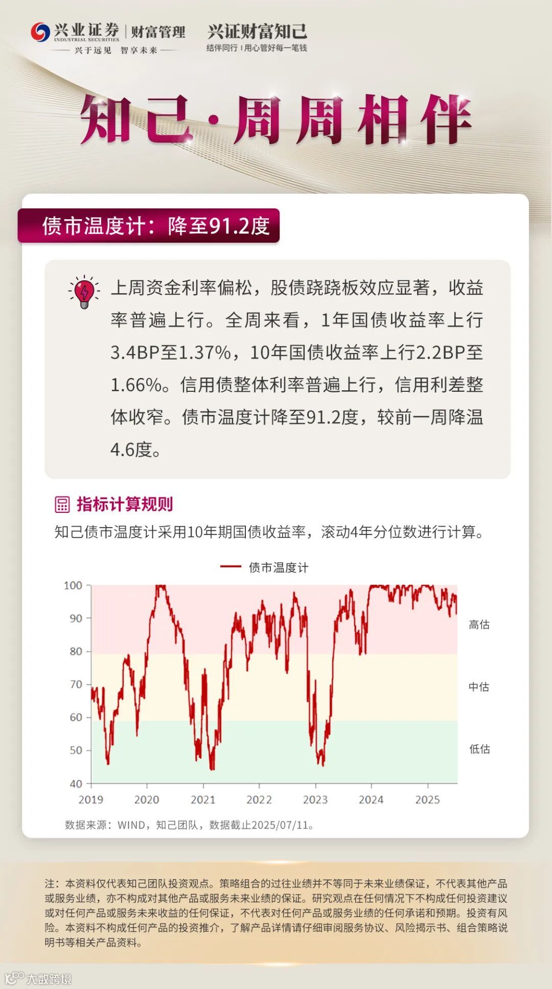 知己·温度计是我们团队设计的一款小工具,他可以清晰地显示市场当前整体所处的估值水平。随着市场不断地由整体走向结构,我们每周为您更新股市温度、债市温度、行业温度、市值温度、券种温度。根据市场温度,为您的每一笔资金做好资产配置,买入合适比例的权益和债券资产。