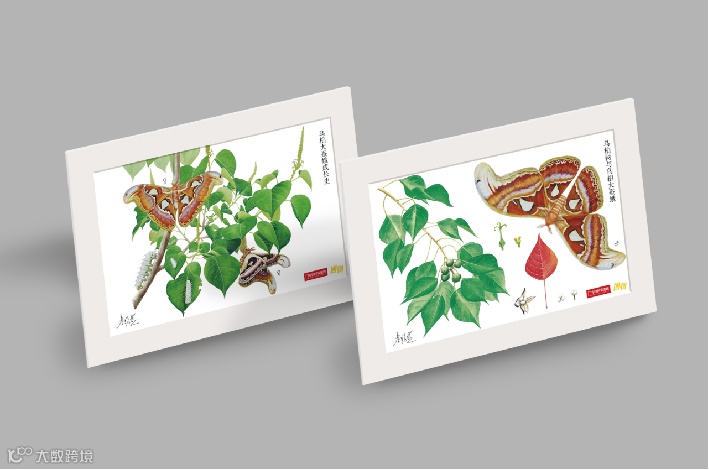 图卡元素选用的绘画作品。设计上采用异形图卡的设计形式,形成一种昆虫飞(爬)落植物上的形式感。