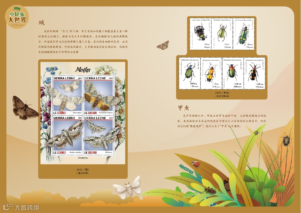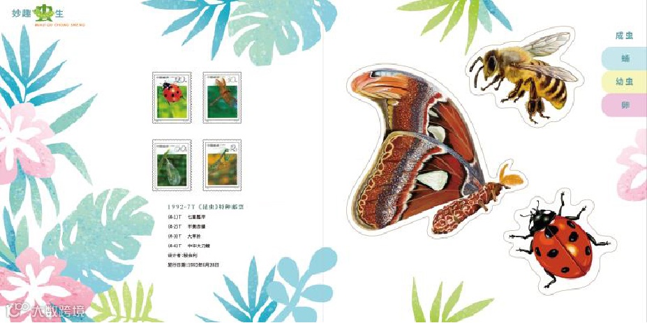 邮册集科普与收藏为一身,邀请《博物》杂志插图编辑李聪颖与艺术家殷会利、韩露等顶尖插画师绘制精美画作,结合中外昆虫邮票的题材,以插画形式展现昆虫的形态与生活环境。邮册以正度16开卡书形式呈现,配色模拟缤纷多彩的自然环境,精致美观。