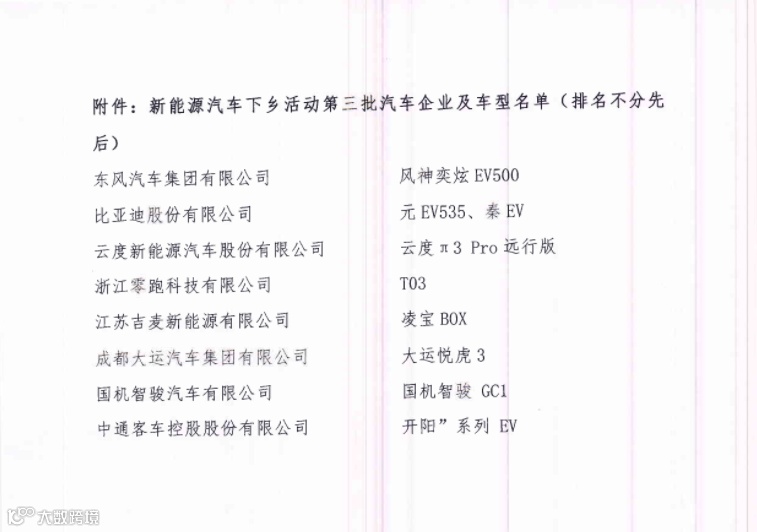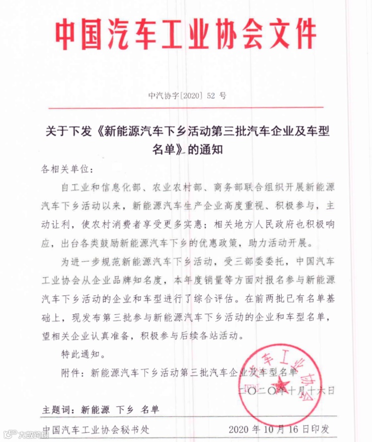 10月19日,中国汽车工业协会公布《新能源汽车下乡活动第三批汽车企业及车型名单》。《名单》显示,包括东风汽车、比亚迪、云度新能源、零跑汽车、江苏吉麦新能源、成都大运、国机智骏和中通客车等在内的8家车企。