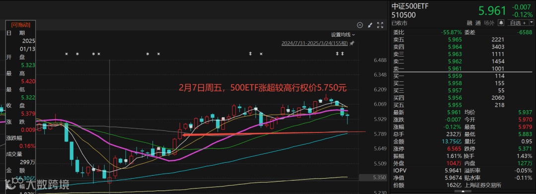当2月7日中证500ETF涨超较高行权价5.750(如图六),则6.100或为下一压力位,可考虑先将义务仓500ETF购2月5750以1441元/张平掉,仅持有实值认购权利仓,或者移仓卖开行权价更高的认购合约,以163元/张卖开500ETF购2月6250。