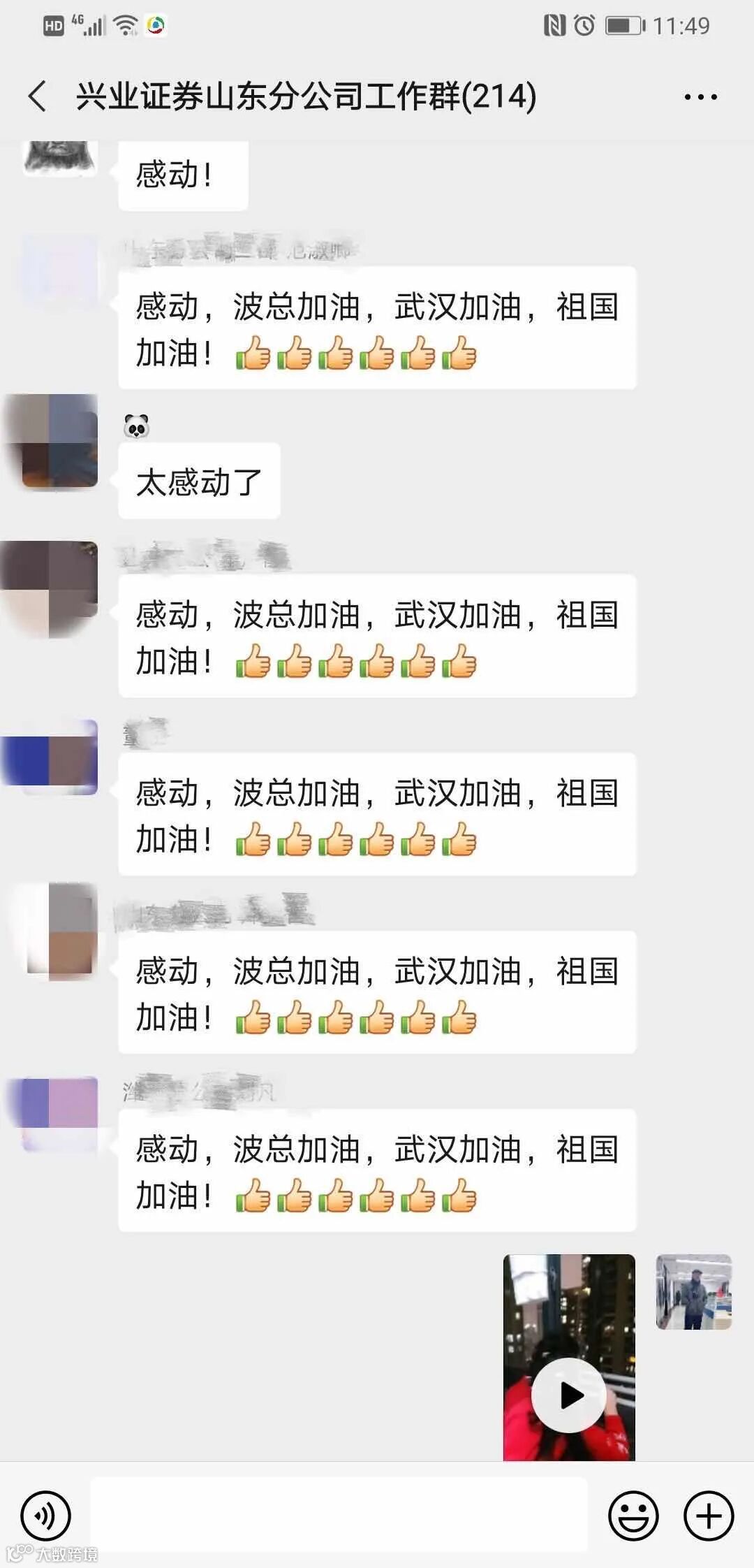 Q:很感谢您把温暖带到团队管理中,激励分公司员工努力工作,感恩社会、回报社会。面对这次疫情,证券行业积极行动,兴业证券第一时间捐款捐物,并通过金融助力抗疫胜利。证券行业连通千行百业,牵系千家百户。作为在一线拼搏的证券人,您怎么看待证券人的使命?