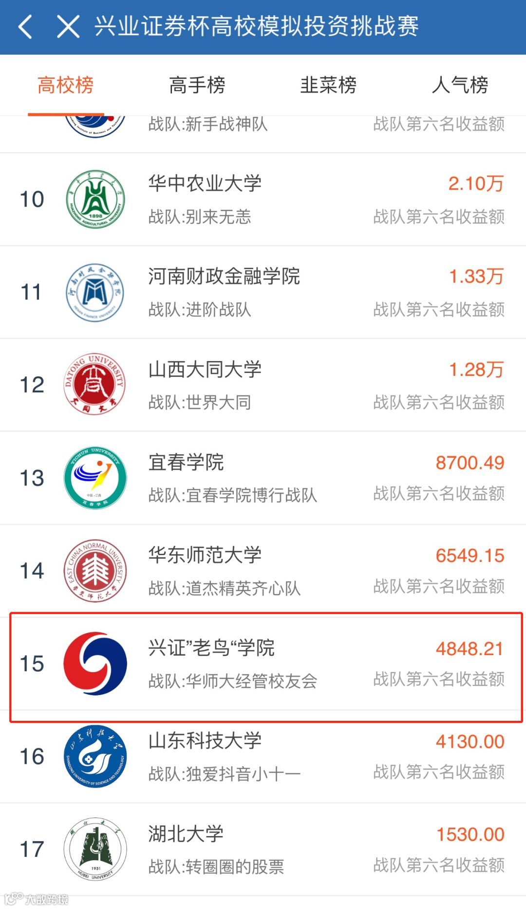为了给比赛增加难度以及趣味性,本次大赛除了有全国各高校的同学参与外,还有兴业证券各分公司的“老鸟”们参与,他们和学生一起争夺榜单排名,高校榜排名最前的“老鸟”战队是华师大经管校友会战队,该战队第六名的收益额为4848.21,团队将获得我们的踢馆团队奖2万现金大奖以及每人一张证书。