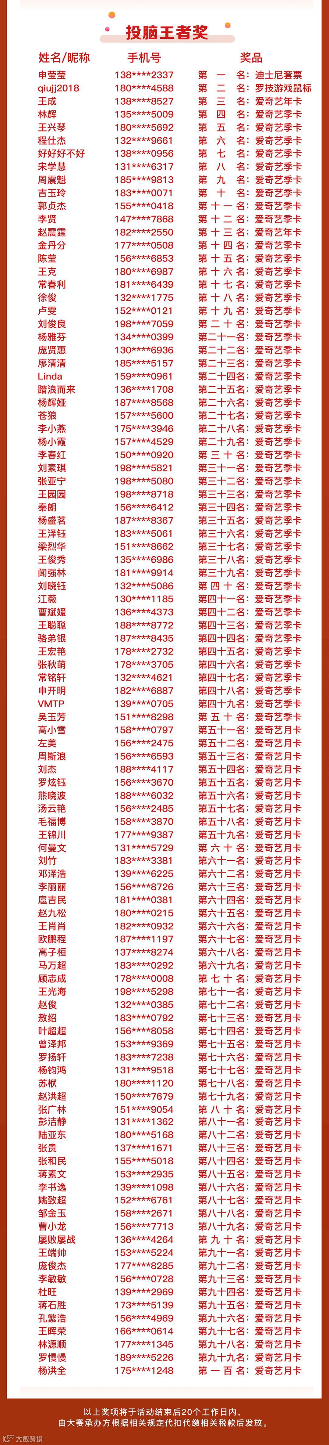第四名到第五十名将获得爱奇艺季卡一张,第五十一名至第一百名将获得爱奇艺月卡一张。