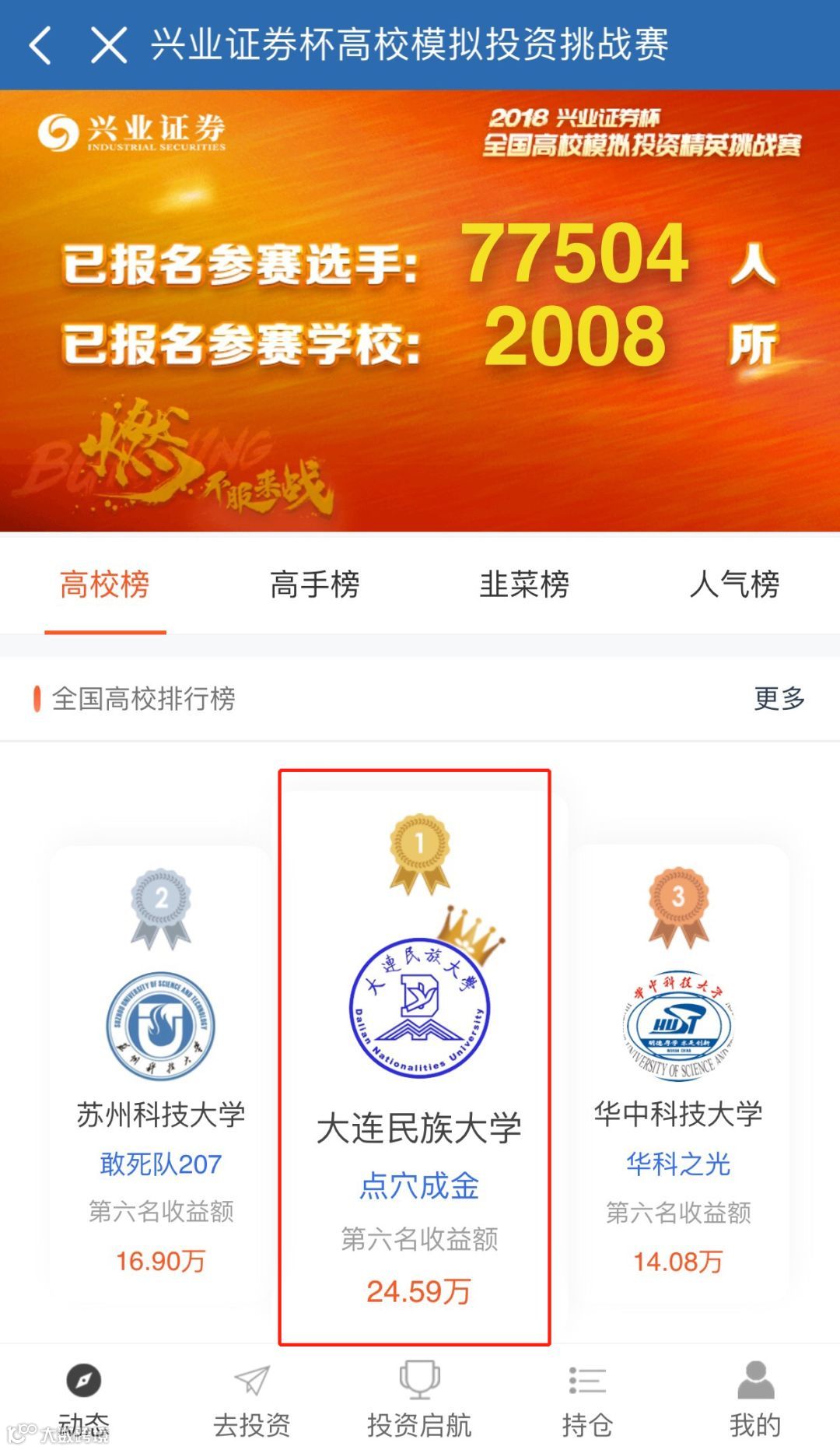 首先当然是揭晓最具含金量的高校团队奖了,高校榜第一名的为大连民族大学的点穴成金战队,在比赛倒计时最后两天中从上千支战队中脱颖而出,该战队第六名的收益额为24.59万,团队将获得我们的十万现金大奖以及奖杯,这可是唯一一个有奖杯的奖项了,另外战队中的每个人都将获得证书一张。