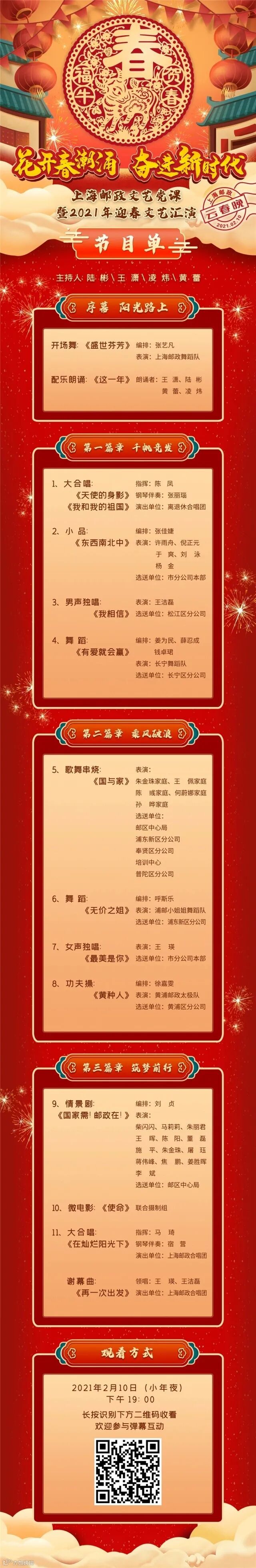 另外,本次节目组还将开展“我最喜爱的邮政春晚TOP5节目”评选,小伙伴们可从罗列的13个节目中,挑选最感兴趣的5个节目进行投票(注意:必须投满5个哦~投票须注明单位、姓名和联系方式)。