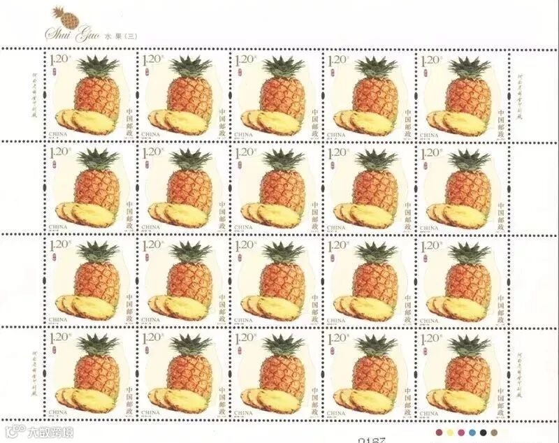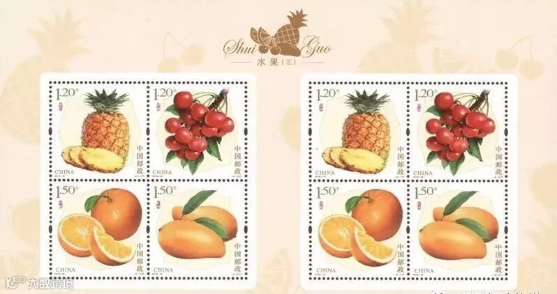 邮票印制分别采用逆向上光、逆向底油(面油)、四色之上着以触感油等工艺,使得水果个个层次突出、质感分明,将水果鲜美香甜的特征展现得淋漓尽致。