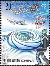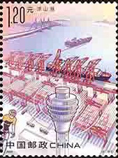 邮票第5枚是洋山港,主画面是全球最大的智能集装箱码头洋山港与东海大桥的现代化基础设施,是迈向新里程的象征。