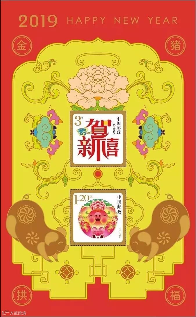注:采用“福寿圆满”和“贺新禧”邮票印制小全张1枚,规格为115毫米×190毫米,专用于2019年中国邮政贺年有奖产品(祝福卡型15元)。