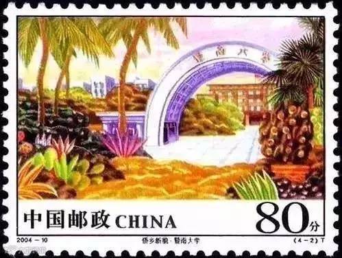 1984发行的《陈嘉庚诞生一百一十周年》邮票中,第二枚画面是陈嘉庚创办的院校楼群。西校门采用花岗石材,以左右延伸的弧面、上方两角微微翘起的长方形为造型基调,主体对称式构图上面配以浮雕,以体现高校大门所应有的庄重性及文化内涵,整个造型简洁、明快、舒展,富有现代感。