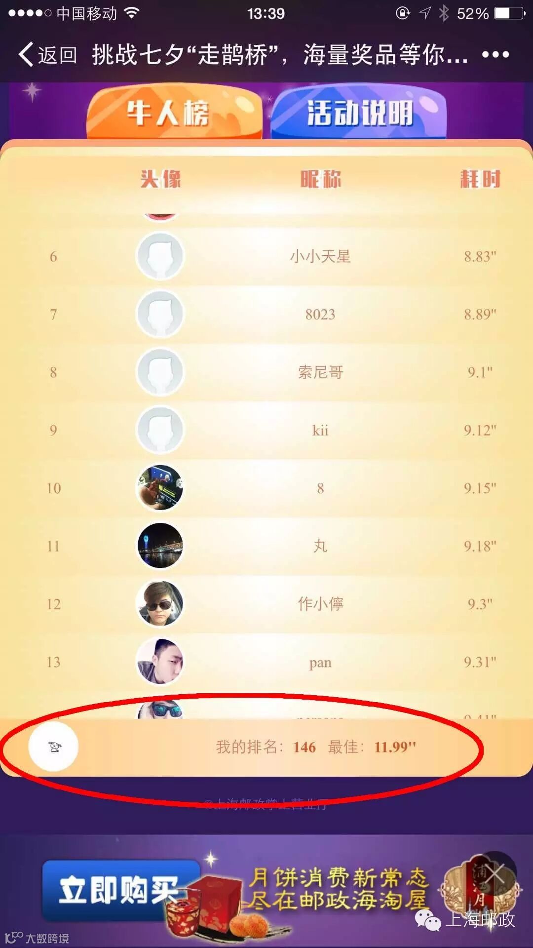 ·凡参与上海邮政官方微信平台“七夕走鹊桥”游戏并在牛人榜名次前77位的用户,需本人携带身份证及中奖手机于2015年8月22日-8月31日期间至北苏州路250号2楼指定窗口兑换奖品。