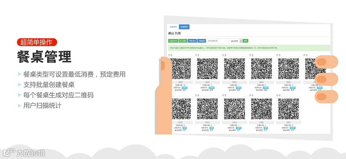管理员可通过后台添加餐台类型并进行设置,实现对店内每一张餐桌进行管理。每一个餐台可生成一个独立的二维码,消费者可通过微信提前预订餐台,到店后扫描该餐台的二维码即可自助选菜下单,既节省了服务员的时间,也便利了消费者。