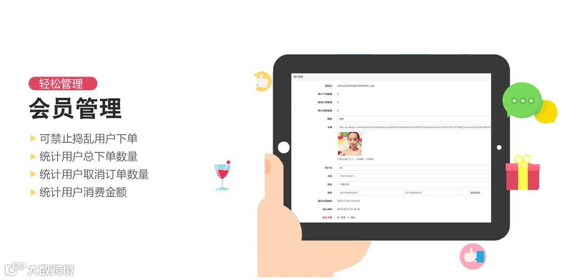 可查看和统计用户总下单数量、取消订单数量、消费金额等,对于“捣乱”的用户,咱们还有禁止下单的权力哦~