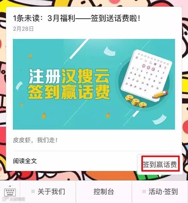 关注“汉搜云平台”微信服务号,点击微信菜单--签到·活动--签到赢话费,或者回复关键词“签到”即可进入签到页面。