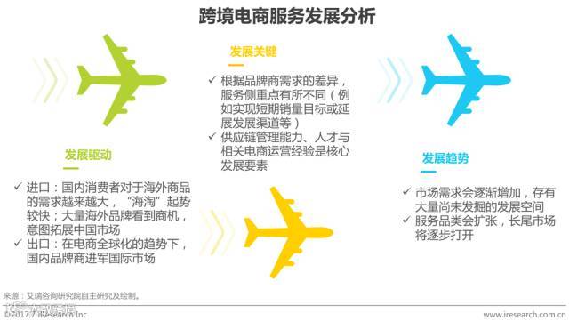 2017年两会期间热议的“一带一路”以及“供给侧改革”,鼓励越来越多的中国优质企业走向全球,给中国跨境电商的进一步发展注入了新的源动力。电子商务将走向国际化与全球化,跨境进出口零售电子商务将成为全球贸易的新形式。因此,跨境零售电商服务成为服务商角逐的蓝海市场。目前,我国跨境进口、出口零售电商服务刚刚起步,未来将伴随跨境电子商务的发展迎来新的机遇。