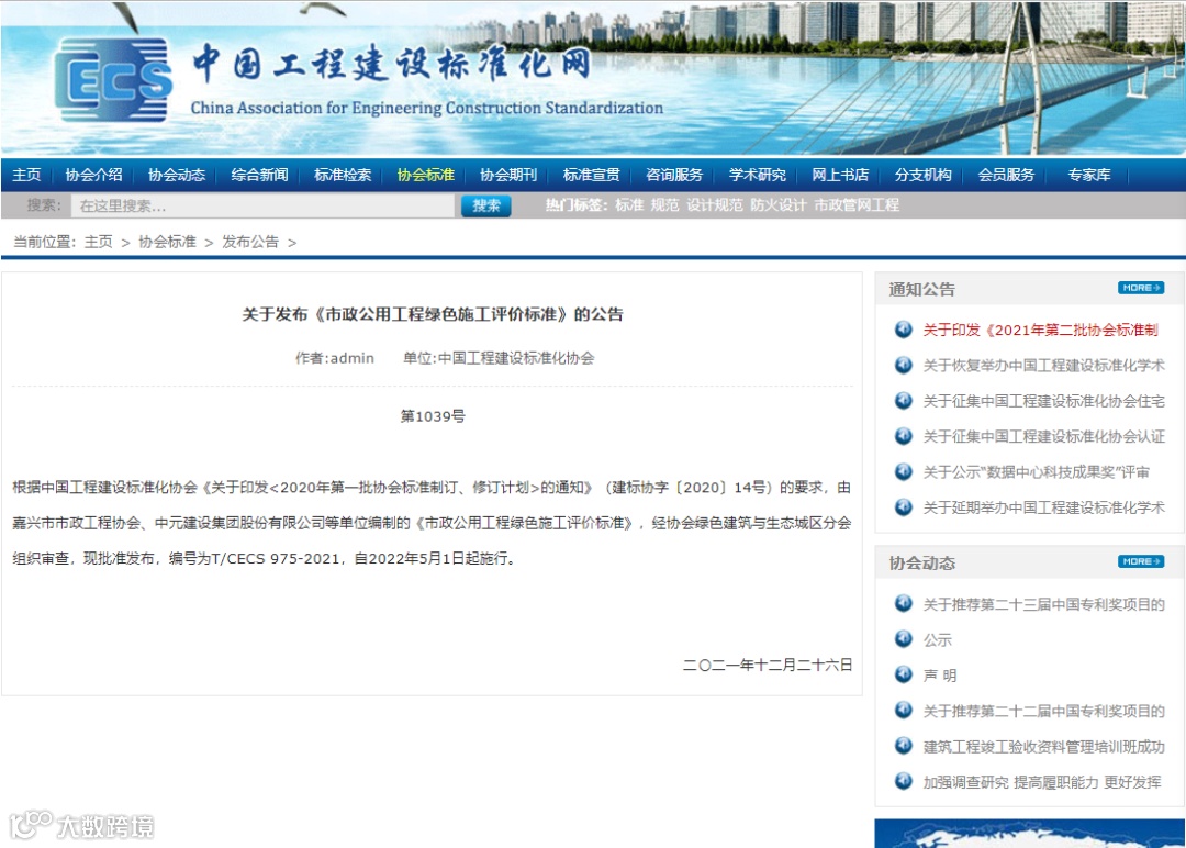 CECS标准《市政公用工程绿色施工评价标准》由嘉兴市市政工程协会与我公司发起立项申请,经标准主管部门审核并向全国公示,于2020年6月28日由中国工程建设标准化协会以建标协字(2020)14号文《2020年第一批协会标准制订、修订计划》予以下达编制计划。