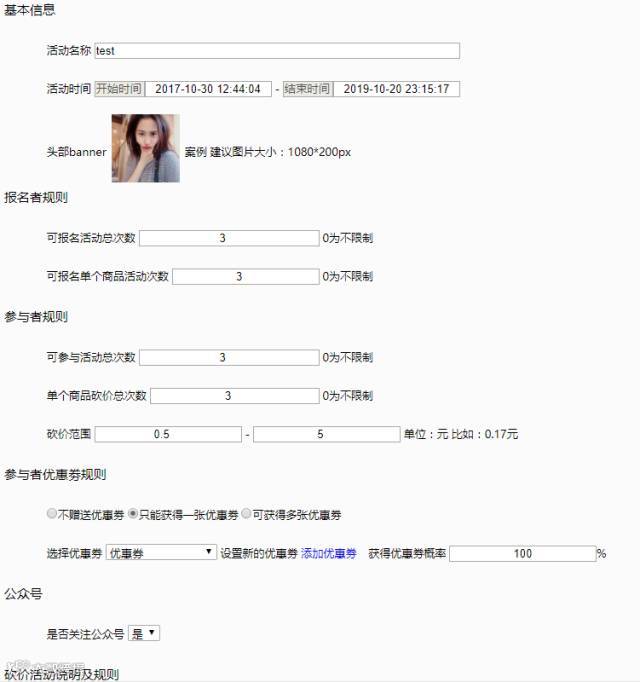 单个活动:自由设置商品数量、报名者报名次数、参与者砍价次数