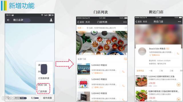 通过公众号自定义菜单形把附近门店、门店列表链接出来方便用户搜索。