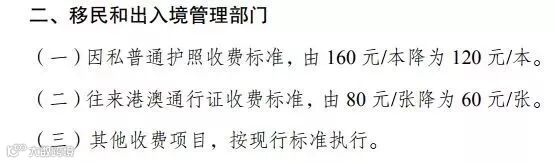 经发改委、财政部研究决定,7月1日起降低部分行政事业性收费标准。其中,因私普通护照收费标准由160元/本降为120元/本,往来港澳通行证收费标准由80元/张降为60元/张。