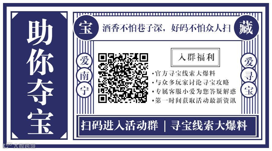 1. 活动期间爱南宁APP注册用户登录寻宝活动专区,完成寻宝任务(日常任务和线下打卡任务),有几率获得“爱¹、南、宁、爱²、寻、宝”6张字卡,集齐6张即可参与藏宝阁抽奖,最高奖金49999元。
