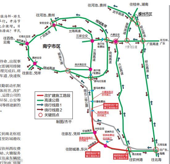 因南钦防改扩建工程已经进入大规模施工阶段,开海节期间该路段将设有15个改道点。其中,南间到黄屋屯服务区之间有6个改道点,黄屋屯服务区到南北枢纽之间有7个改道点,卜家互通至防城港收费站有2个改道点。