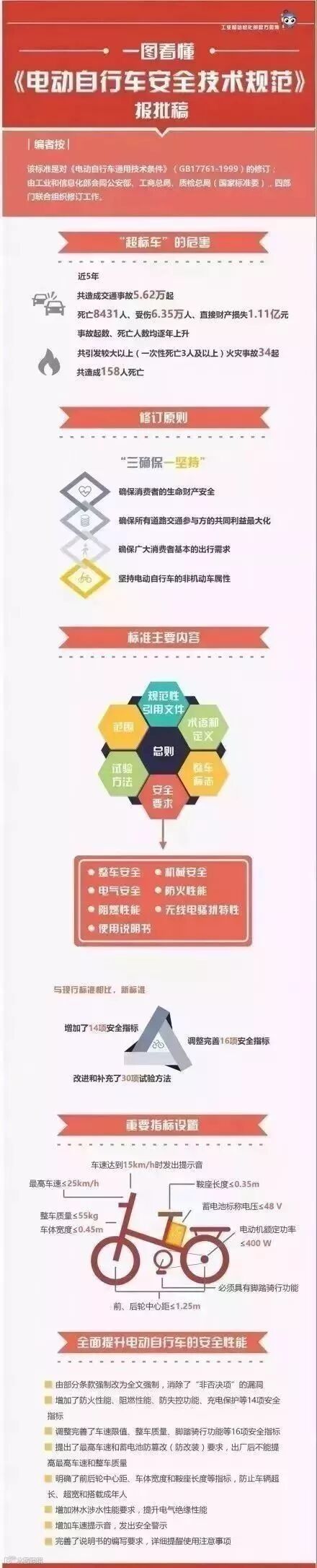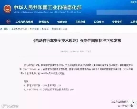 近日,根据国家标准管理程序,工业和信息化部组织修订的《电动自行车安全技术规范》强制性国家标准(GB 17761-2018),由国家市场监督管理总局、国家标准化管理委员会《中华人民共和国国家标准公告(2018年第7号)》批准发布,自2019年4月15日正式实施。