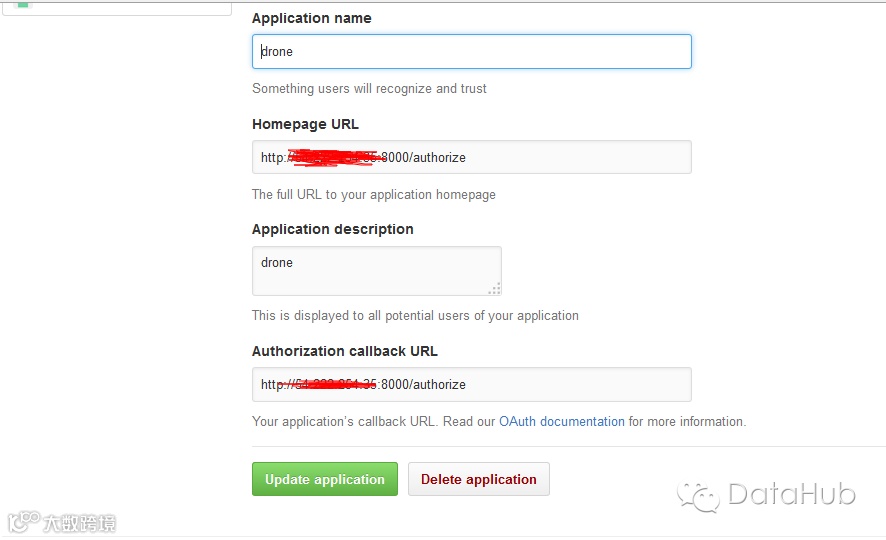 点击developerapplications中的register a new application,进入以下页面进行drone的配置: