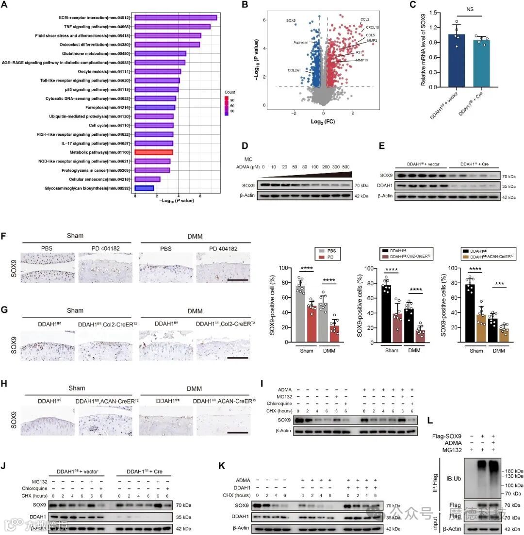 为了更好地了解其机制,研究了ADMA处理细胞的蛋白质组学。对差异表达的蛋白质进行亚细胞定位、基因本体和直系同源组簇分析。KEGG分析揭示了几种富集的OA相关途径,如ECM受体相互作用、TNF信号通路、细胞衰老和糖胺聚糖生物合成(图1A)。火山图显示分解代谢因子(MMP3和MMP13)、衰老标志物(P21)和炎症趋化因子(CCL2、CCL5和CXCL10)上调,合成代谢因子(聚集聚糖、COL2A1和SOX9; 图1B)。先前的一项研究表明,SOX9缺乏导致健康软骨中的蛋白多糖丢失,并导致创伤后使用OA后严重的软骨侵蚀SOX9FL/FL,ACAN-CreER系列T2航站楼小鼠。考虑到SOX9是蛋白质组学中变化最显著的蛋白质之一,也是软骨中最关键的转录因子之一,接下来重点关注SOX9是否是受ADMA影响的核心蛋白。RT-PCR显示,DDAH1的缺失不会显著改变SOX9 RNA水平(图1C)。然而,SOX9蛋白表达在暴露于ADMA或DDAH1缺失的软骨细胞中主要下调(图1D和E)。此外,免疫组化表明,关节注射PD 404182(图1F)或从DDAH1型FL/ FL,Col2-CreER型T2和DDAH1型FL/ FL,ACAN-CreER系列T2小鼠(图1G和H)。此外,SOX9在ADMA暴露细胞中的半衰期比对照细胞短,表明ADMA导致SOX9的不稳定性。MG132(一种蛋白酶体抑制剂)处理阻断了SOX9的衰变,而氯喹(一种溶酶体抑制剂)则没有,这表明SOX9降解依赖于蛋白酶体而不是溶酶体途径(图1I和J)。此外,ADMA诱导的SOX9衰变在过表达DDAH1的软骨细胞中被部分逆转(图1K)。值得注意的是,ADMA增加了泛素化SOX9的水平(图1L)。ADMA 共同通过泛素-蛋白酶体途径触发SOX9降解。