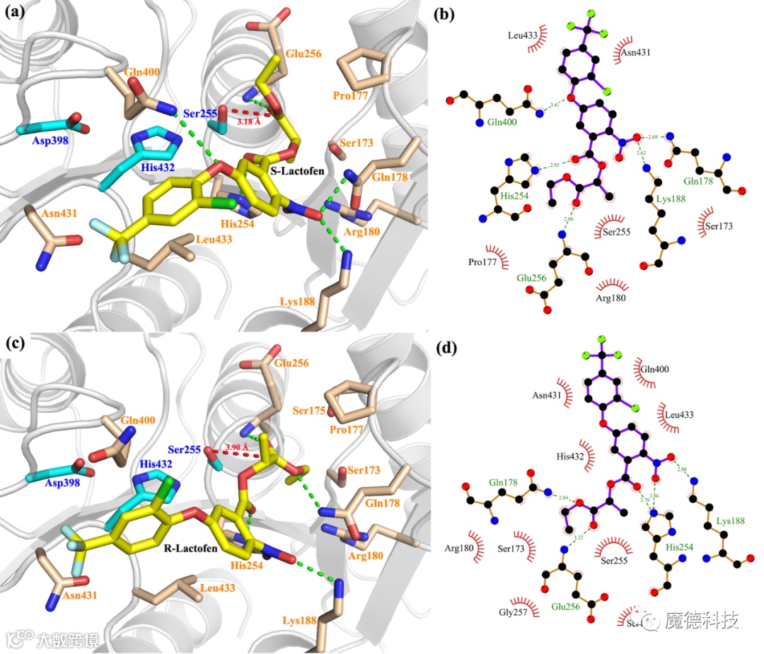 同样地,R-Lactofen结合在相同的口袋中,但由于手性构型的变化,甲基朝向Ser255,并导致末端酯基部分的构象发生变化,并与Gln178和Glu256形成氢键,而苯环之间氧原子的氢键消失。而催化中心Ser255与羰基碳原子之间的原子距离则增大到了3.90 Å。