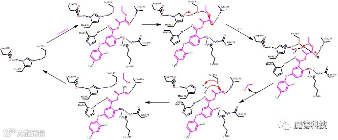 根据分子对接结果,并基于文献中对于该类酶催化机理的预测,本文对LanE酶酶催化底物S-Lactofen酯键水解的反应过程进行了推测,如图2所示。从图中可以看出,LanE酶催化的反应过程如下:S-Lactofen先结合到LanE酶的催化活性位点,催化中心Ser255羟基上的氢原子转移到His432上,形成氧负离子,并进攻羰基碳原子,形成C-O键;然后由一个水分子作为介质,His432上的H原子转移到水分子,水分子的H转移到末端的氧原子,断开S-Lactofen的C-O键,脱去乙醇分子,Ser255与S-Lactofen剩余部分形成酯键;最后在水分子的作用下,Ser255恢复初始结构,S-Lactofen形成最终产物羧酸,完成酯水解催化反应。由于S-Lactofen水解之后的结构仍然包含一个酯结构,因此该结构可能在活性位点调整结合构象并再次发生催化酯水解反应。