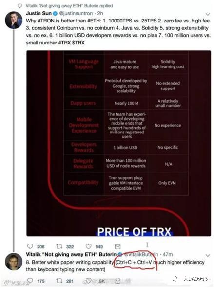 孙哥当时发挥其碰瓷热点的特长,推特上大谈“波场优于以太坊ETH的7大优点”,V神是个实诚人,果然上钩,还回复了孙哥,回怼“波场只会对以太坊的白皮书进行复制粘贴”——结果又给孙哥带来了一波热度,正中下怀。