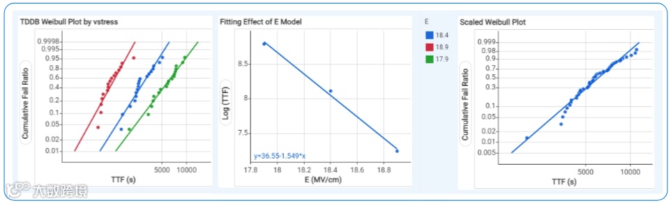 可视化分析:上图TDDB Weibull plot by Vstress展示了不同工作电压下 Lifetime的Weibull分布对比,Fitting Effect of E Model在不同电压环境下取不同的TTF对数做线性拟合,得到γ电场加速因子,Scaled Weibull Plot表征总体的累计失效率的分布情况。以上视图快速实现TDDB 预测可视化。