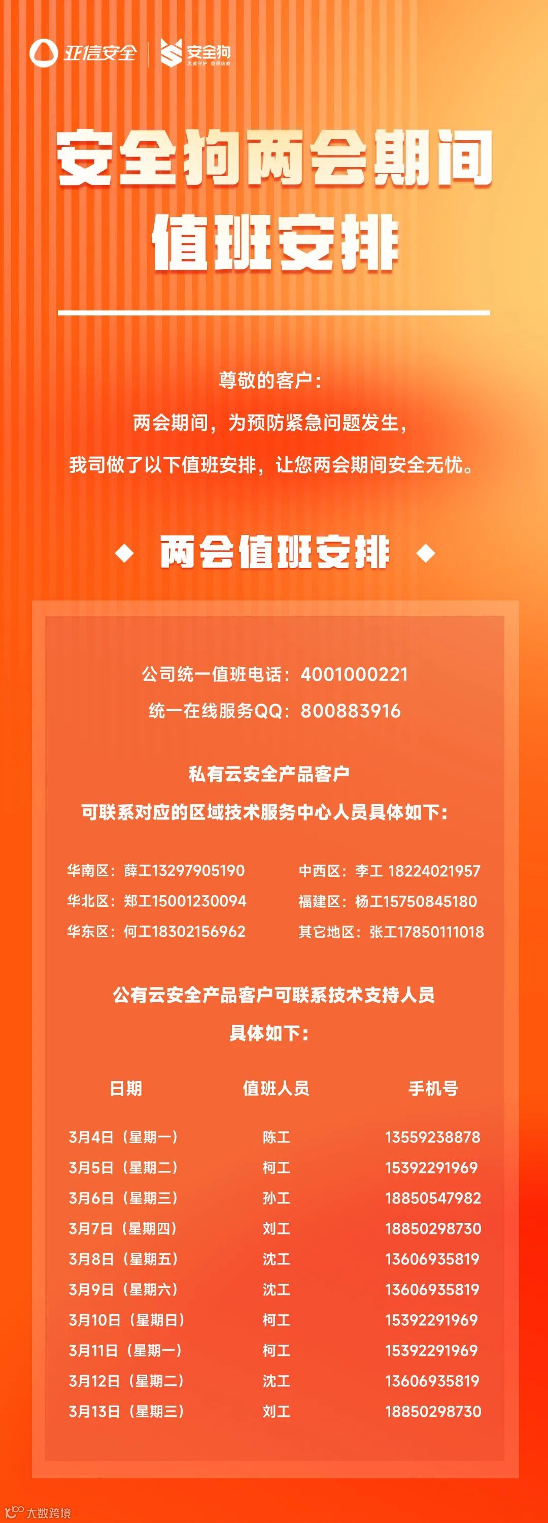 为了帮助用户更安全地迎接“两会”,安全狗做了如下值班安排,第一时间响应广大客户们的安全需求。