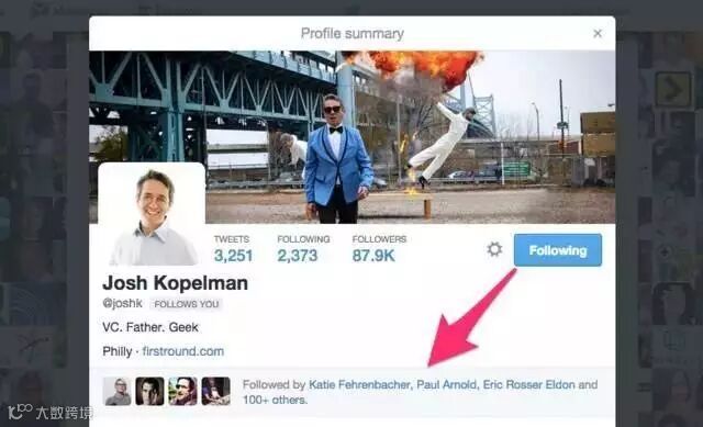 举个例子,你打开某人的Twitter主页,上面会显示此人的关注者中,有多少是你认识的人,这样,你关注此人的可能性就会大大增加。关注就成了水到渠成之事。