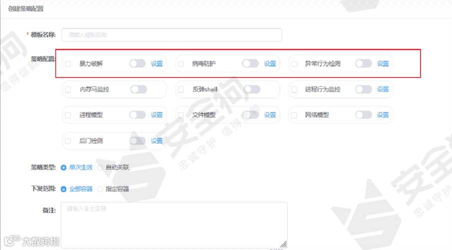 运行时策略:内置运行时模板并支持自定义。可设置批量策略、自动化策略、策略关联,实现容器上线即防护;
