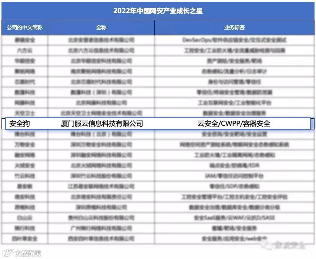 据悉,此次调研企业数量近300家,覆盖了国内核心网络安全企业。安全狗通过自身领先的技术创新水平以及良好的市场用户基础,从中脱颖而出,获得了2022中国网络安全产业成长之星的荣誉称号。