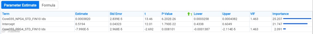Parameter Estimate展示了各自变量在模型中的重要程度,通过该表可查看哪个变量对因变量的影响最为显著。Formula,可查看当前模型的拟合公式。
