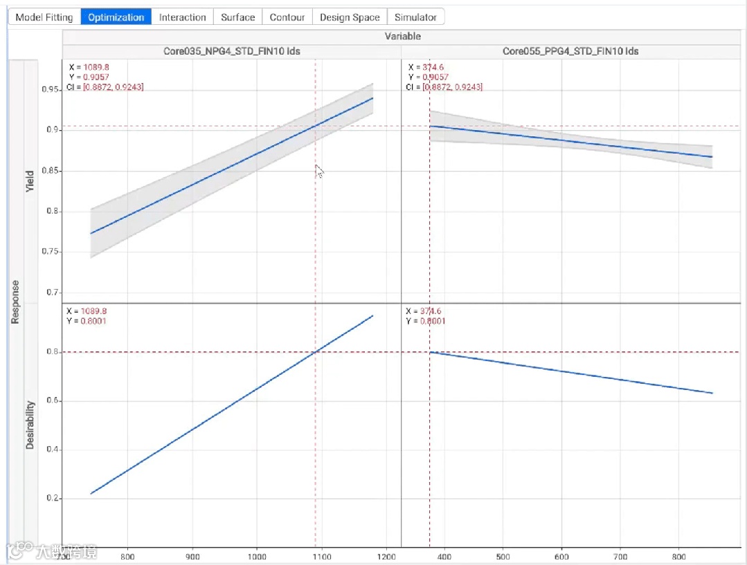 主要影响因子确定后,工程师可以搭配DE-G中的刻画器,通过拖动图中的十字标,直接查看相应条件下的预测结果,寻找良率提升的最优配置。后续,工程师需要结合自己的专业知识,将“理论建议”转化为实际方案,确认其建议值是否处于正常工艺窗口内,是否具有可实施性等。经过评估验证后,在进行后续实验,以实现产品良率提升。